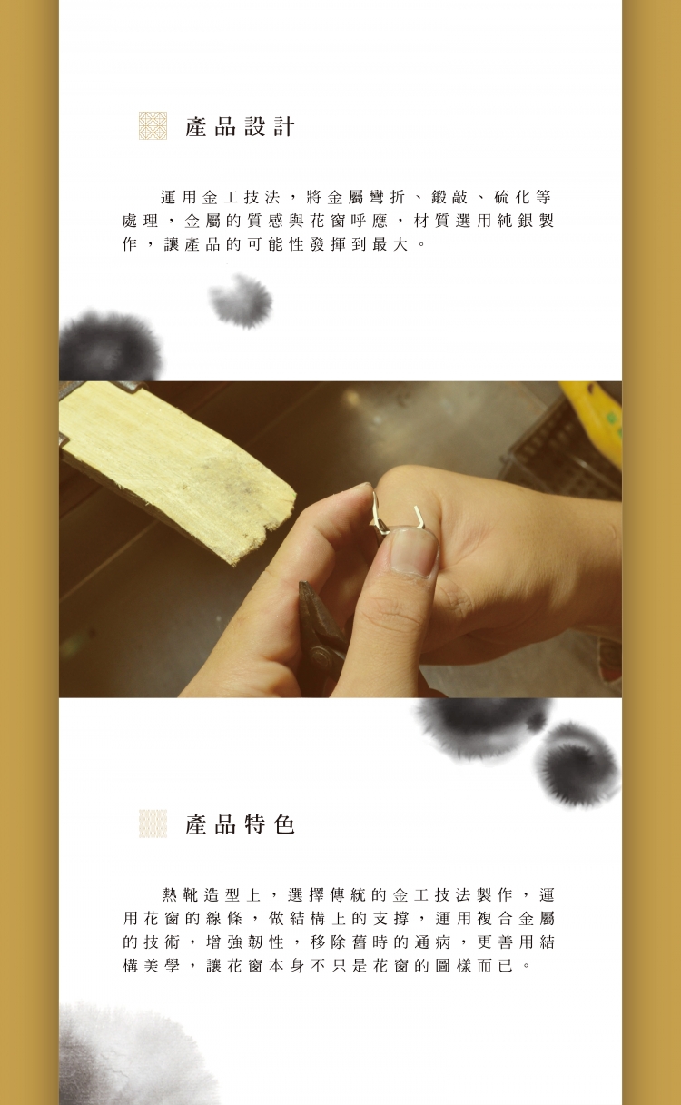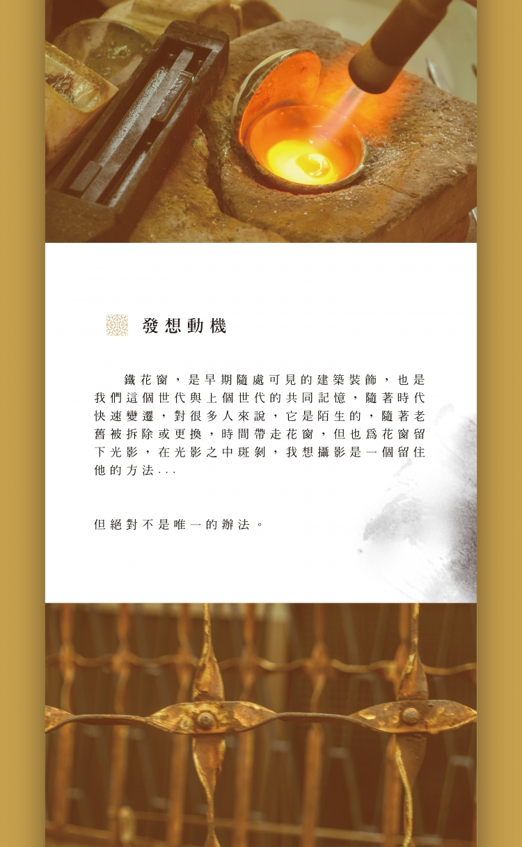 鐵花窗,是早期隨處可見的建築裝飾,也是我們這個世代與上個世代的共同記憶,隨著時代快速變遷,對很多人來說,它是陌生的,隨著老舊被拆除或更換。 品牌形象提一字「晝」將花窗文化延伸紋路設計,結合了早晨到傍晚的光影灑落在花窗上的變化延伸三大系列,並引入金工技術結合花窗文化特色,製作熱靴銀飾設計。